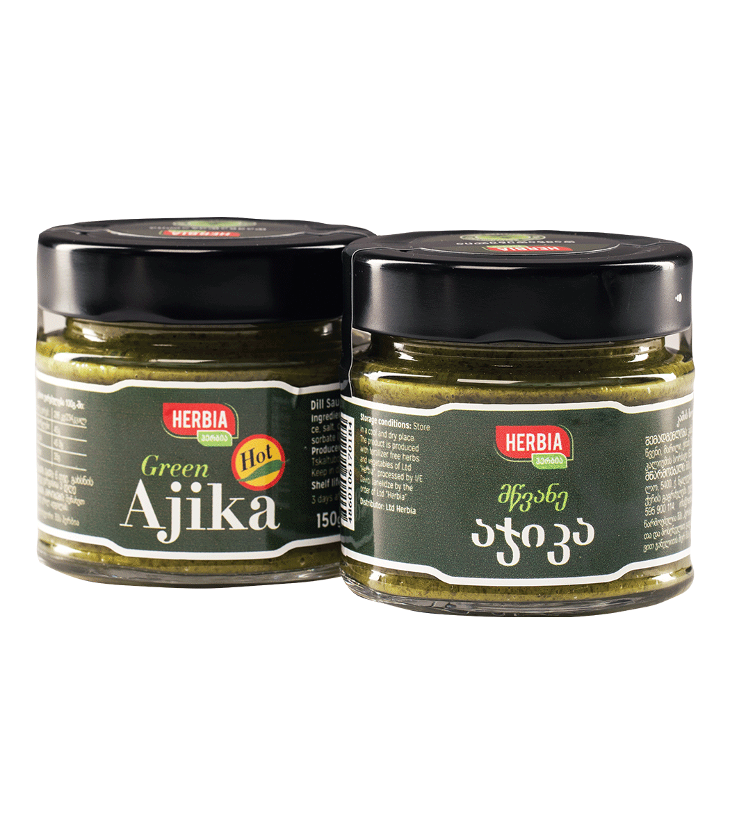 მწვანე აჯიკა – ქართული ტრადიციული რეცეპტით დამზადებული ცხარე სოუსი, რომელიც მზადდება ახალი მწვანილებით, მწვანე წიწაკითა და სანელებლებით. იდეალურია ხორცის, ბოსტნეულის და პურზე გადასმელადაც კი. მისი გამორჩეული პიკანტური გემო ნებისმიერი კერძის ნამდვილ ქართულ ხასიათს მიანიჭებს.